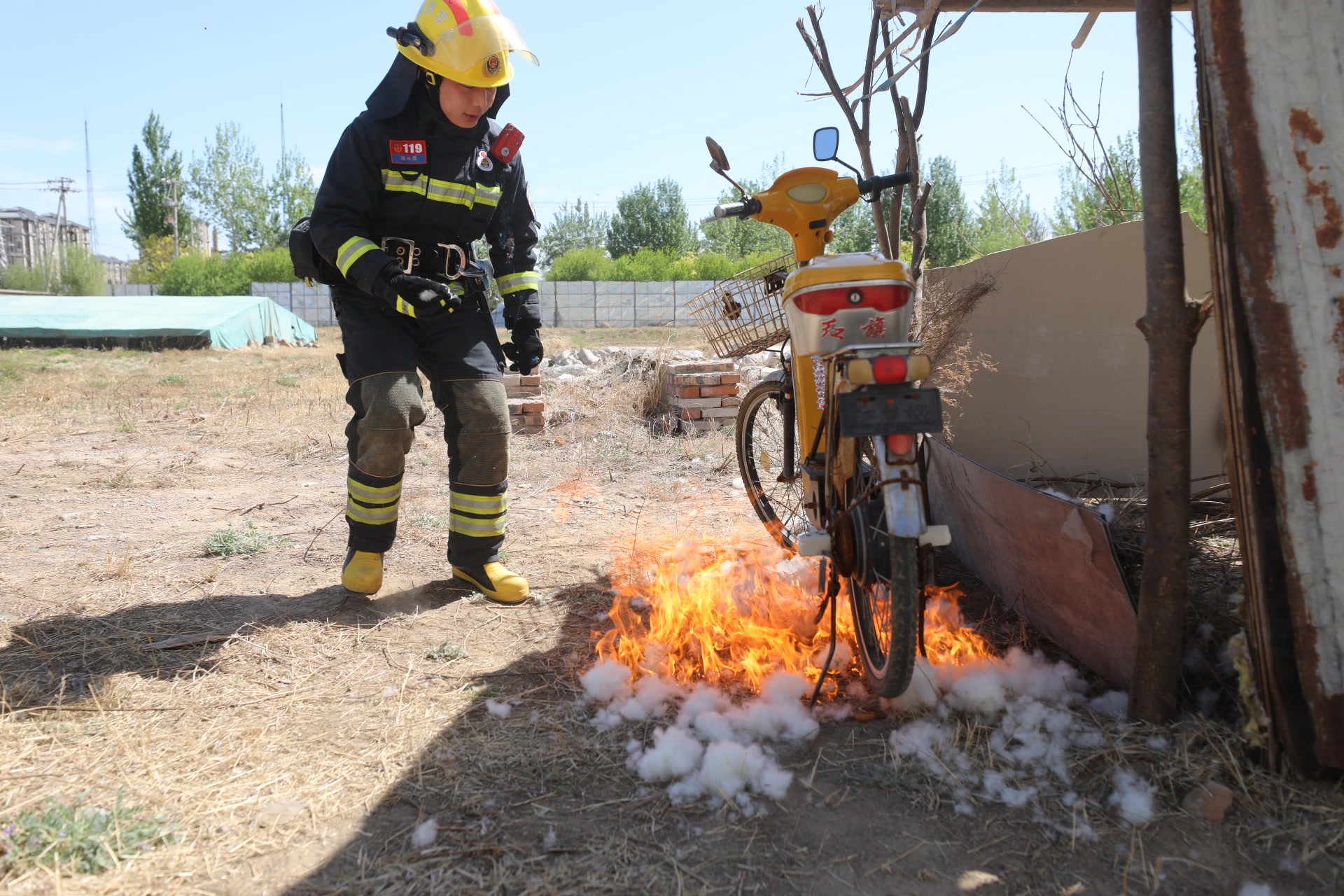 今天上午的實驗安排在大興區(qū)魏善莊消防救援站旁邊的空曠荒地,一輛消防車和幾名消防員嚴(yán)陣以待,水帶鋪設(shè)至實驗場地邊,隨時出水,以防意外。實驗?zāi)M楊柳絮長時間堆積不清理,且周邊有雜草、枯枝等可燃物的情況,并將一輛電動自行車放置旁邊——這也是現(xiàn)實生活一些疏于管理的停車棚的樣子。