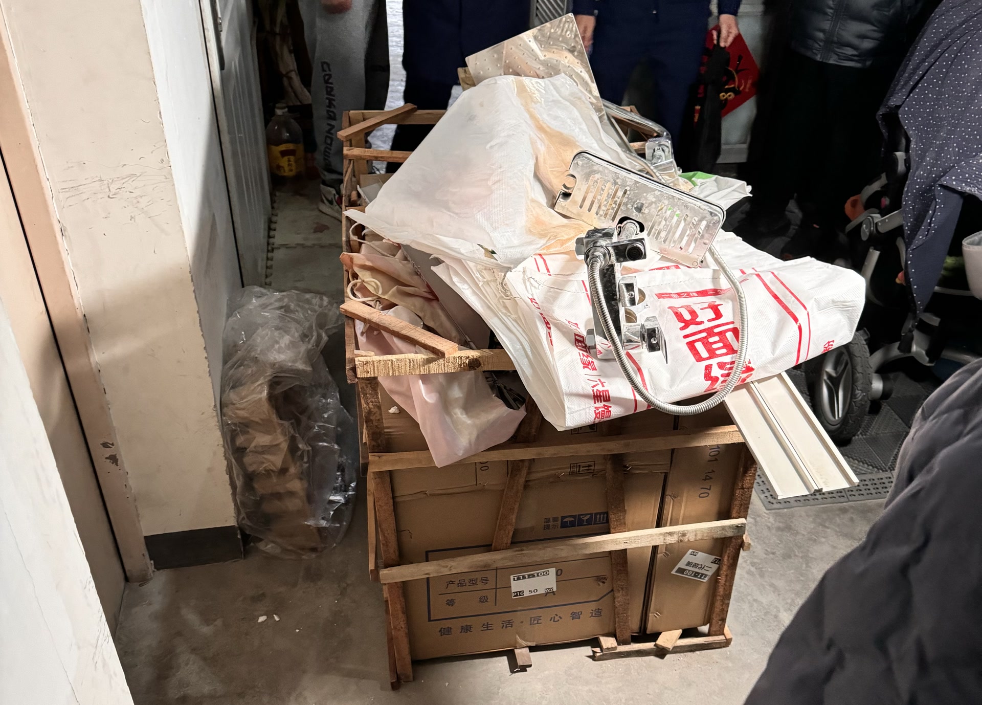 在新景家園小區(qū)西區(qū)五號樓4單元13層,樓道里堆放的裝修材料。