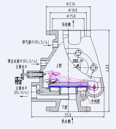 主閥由閥體、內(nèi)座圈、外座圈、閥瓣組件、閥蓋等零部件組成。閥瓣組件和內(nèi)外座圈將主閥分為三個(gè)部分,即上腔、中間腔和下腔。上腔為關(guān)閉的閥瓣以上部分的閥腔,與系統(tǒng)管網(wǎng)相連,充有壓力氣體;中間腔為關(guān)閉的閥瓣與內(nèi)、外座圈圍成的環(huán)狀空間,因閥瓣同時(shí)封閉外座圈和內(nèi)座圈,所以中間腔既不與上腔相通,又不與下腔相通,而通過孔道與大氣相通;下腔為關(guān)閉的閥瓣以下部分的閥腔,與供水側(cè)管道相連,充有壓力水。