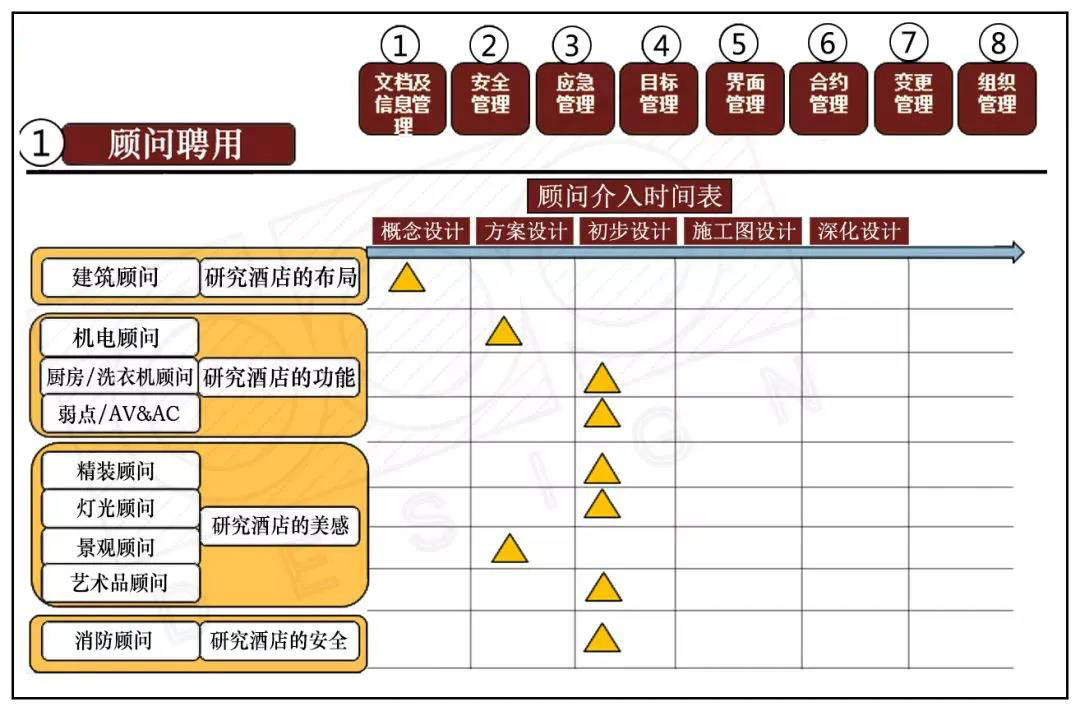 在中大型的設(shè)計(jì)項(xiàng)目中,必然會(huì)涉及到二次機(jī)電的相關(guān)問(wèn)題,大家要清楚的了解項(xiàng)目階段以及所需要哪些專業(yè)顧問(wèn)來(lái)配合設(shè)計(jì),更重要的是,在甲方面前也能有的放矢的根據(jù)進(jìn)度款以及合同的界面進(jìn)行設(shè)計(jì)人力資源的調(diào)度與安排,合理的與甲方周旋。