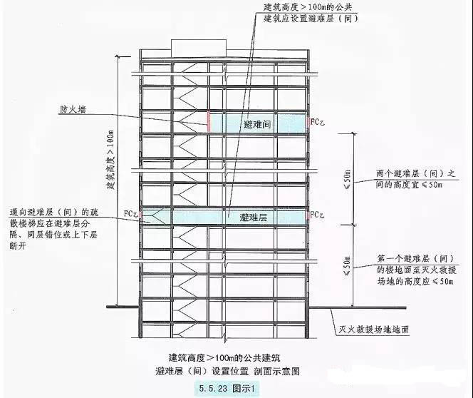注意:避難層的第一個(gè)50m是從滅火救援場(chǎng)地地面到第一個(gè)避難層地面,以上避難層均為地面到地面的距離差。