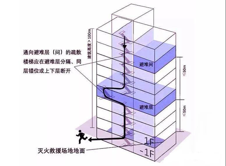 避難層應(yīng)至少有兩個(gè)不同的疏散方向可供疏散,通向避難層的疏散樓梯應(yīng)在避難層分隔、同層錯(cuò)位或上下層斷開(kāi)。