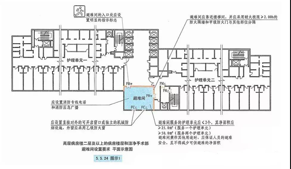 2、為了滿足高層病房樓和手術(shù)室中難以在火災(zāi)時(shí)及時(shí)疏散的人員的避難需要和保證其避難安全,高層病房樓應(yīng)在二層及以上各樓層和潔凈手術(shù)部設(shè)置避難間,避難間可以利用平時(shí)使用的房間,如每層的監(jiān)護(hù)室,也可以利用電梯前室。病房樓按最少3部病床梯對(duì)面布置,其電梯前室面積一般為24m²~30m²。但合用前室不適合用作避難間,以防止病床影響人員通過(guò)樓梯疏散,避難間的其他防火設(shè)計(jì)和消防設(shè)施應(yīng)符合規(guī)范5.5.24要求,如圖所示: