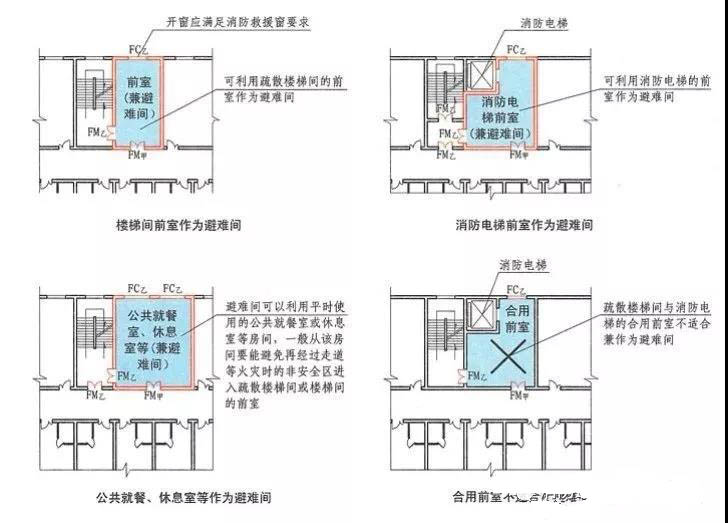 避難層可供避難的凈面積不應(yīng)小于12㎡,避難間可利用疏散樓梯間的前室和消防電梯的前室,避難間可以利用平時(shí)使用的公共就餐室或休息室等房間,一般從該房間要能避免再經(jīng)過(guò)走道等火災(zāi)時(shí)的非安全區(qū)進(jìn)入疏散樓梯間或樓梯間的前室;避難間的門可直接開(kāi)向前室或疏散樓梯間。