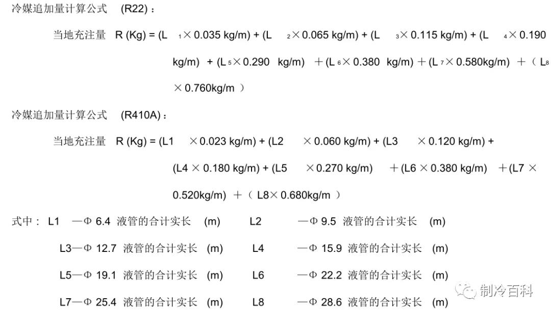 注意:不同系列,不同品牌空調(diào)系統(tǒng)冷媒追加的公式可能不同,因此必須根據(jù)各品牌系統(tǒng)“安裝資料說明書”里面的追加公式為準(zhǔn),以免出現(xiàn)錯誤。以下表格僅做參考!
