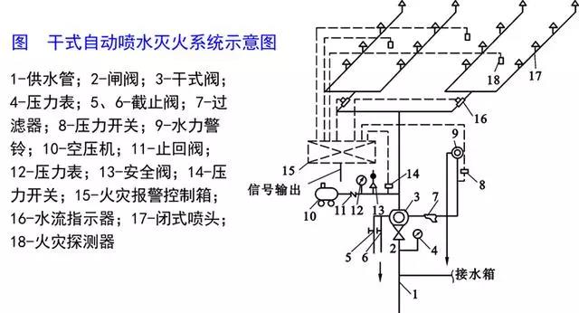 系統(tǒng)組成:干式自動噴水滅火系統(tǒng)組成:干式噴頭、干式閥、水力警鈴、排氣加速器、自動充氣裝置和供水管路等組成。