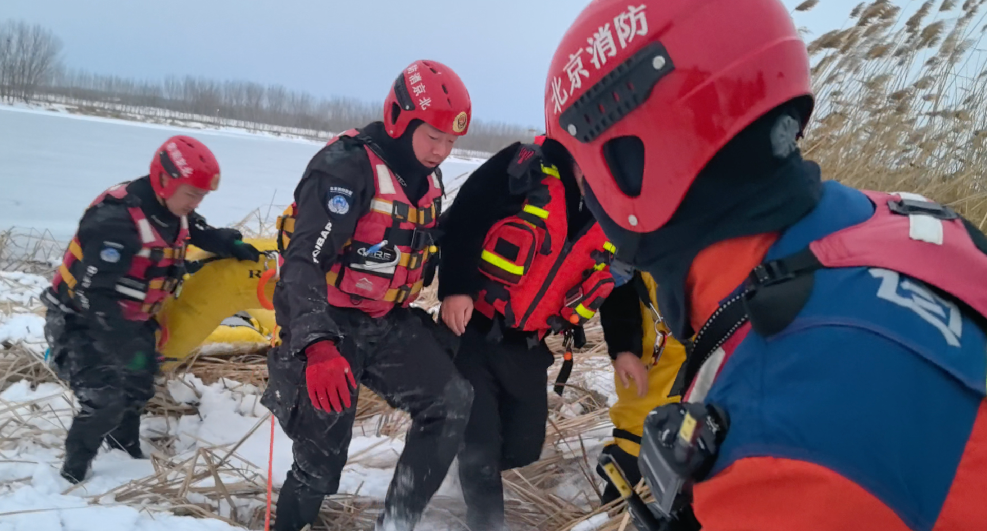 消防救援人員率先到場(chǎng)后發(fā)現(xiàn),事發(fā)河段位于北京與河北交界處,河面寬闊約160多米,靠近北京的一側(cè)有大片冰面,靠近河北的一側(cè)有少許水面,而報(bào)警男子正困于冰、水交界的地方。