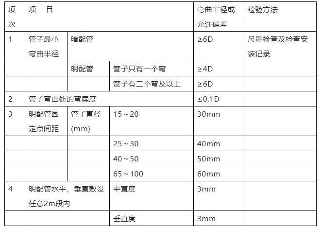 (7)按不同檢查部位、內(nèi)容各抽查20處,電線保護(hù)管彎曲半徑,明配管安裝允許偏差和檢驗(yàn)方法符合下表規(guī)定。