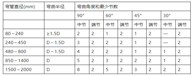 (1)圓形彎管的彎曲半徑(以中心線計(jì))和最少節(jié)數(shù)應(yīng)符合表2的規(guī)定。